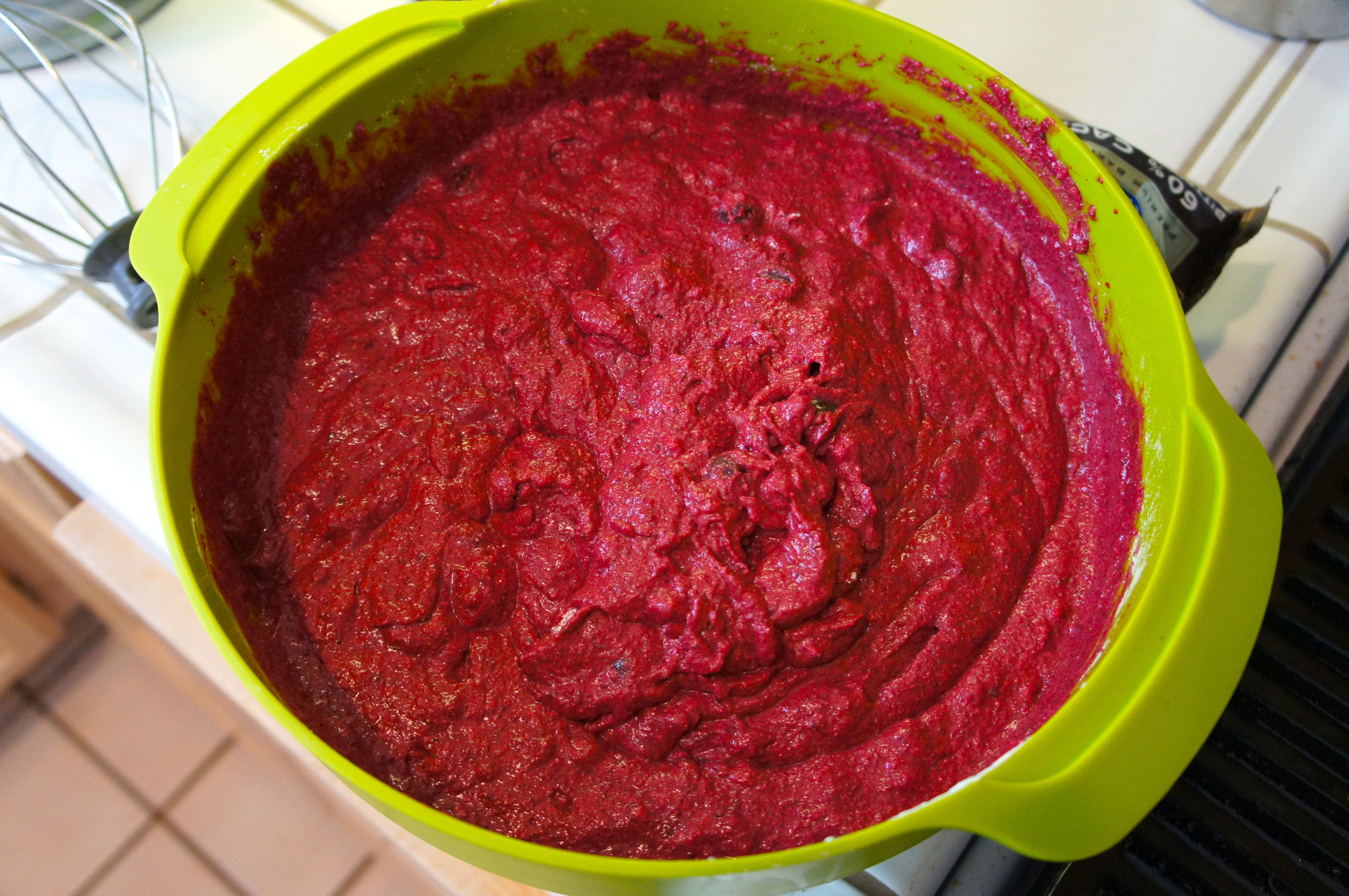 6.  Combine wet and dry ingredients, stirring gently until combined. Some floury spots are ok. You will get a big bowl of weird pink fluffy stuff. Yum!